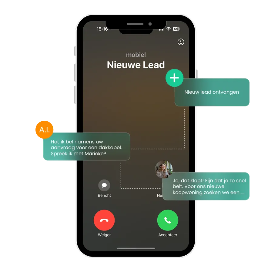 De AI regelt alle opvolging automatisch via WhatsApp en Voice, op basis van de antwoorden in de quiz. Jij krijgt alleen een melding wanneer iemand klaar is om een gesprek te voeren — en dat gesprek staat dan al in je agenda.